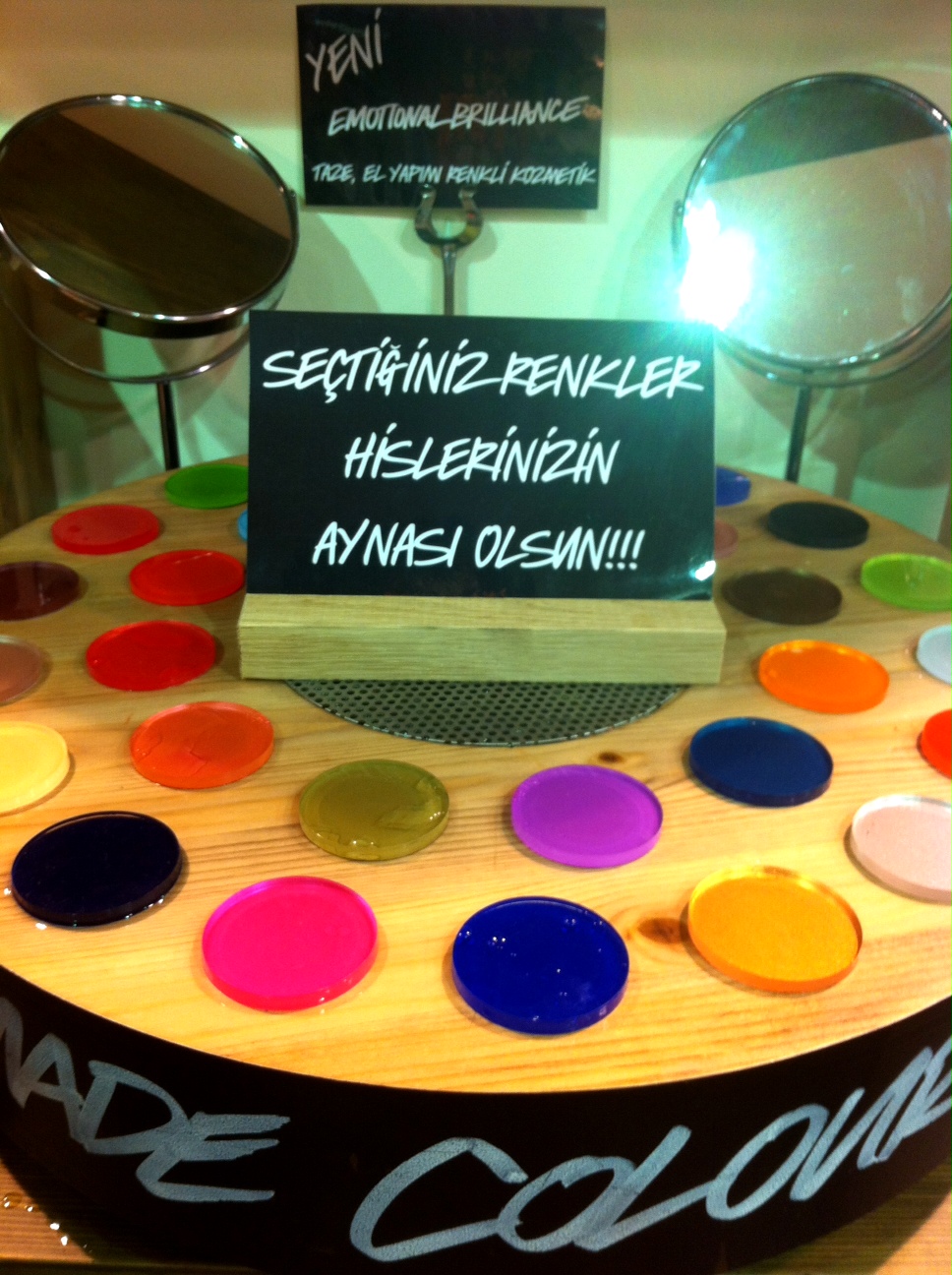 Lush benim sevdiğim ve keyifle kullandığım ürünlere sahip bir kozmetik markası. Özellikle sabunlarını ve Bubblegum aromalı lip scrub’ını çok keyifle kullanıyorum. Ürünler el yapımı, hayvanlar üzerinde denenmiyor ve taze! Bu yeni ürünlerinin ismi de “Emotional Brilliance”; ruj, far ve allık olarak kullanılabilecek çok amaçlı bir ürün. Rengarenk çark sizin için dönüyor ve siz gözünüze ilk çarpan üç rengi seçiyorsunuz. Bu üç renk aynı fal gibi size şu anda içinde bulunduğunuz ruh hali, neye ihtiyacınız olduğu ve neler olacağını size anlatan adlara sahip. Eğlenceli değil mi? Benim favorim mor, eyeliner gibi kullanmayı tercih ediyorum.