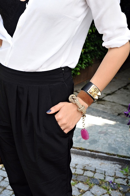 I am wearing my Mango silk pants and deep V neck white silk shirt combined with my fave Ipekyol necklace. Bracelets from Tresera, Topshop and Forever New.